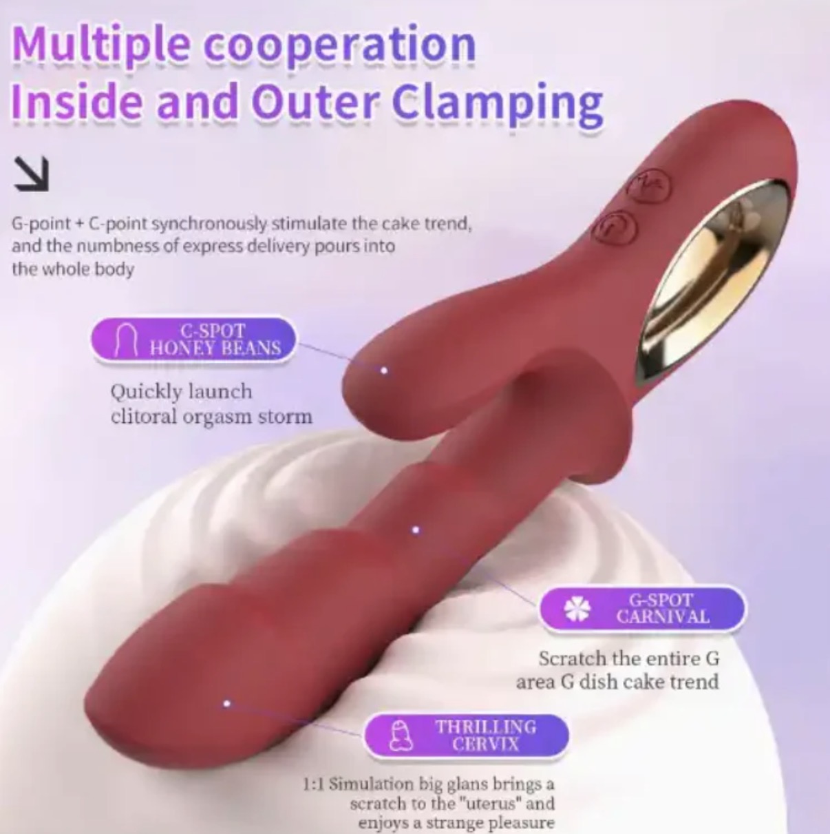 Vibración y Modos• 12 modos de vibración típicos en este modelo(variaciones desde ritmo suave hasta pulsaciones intensas)• Estimulación dual: tanto interior (G-spot) como exterior (clítoris) al mismo tiempo.